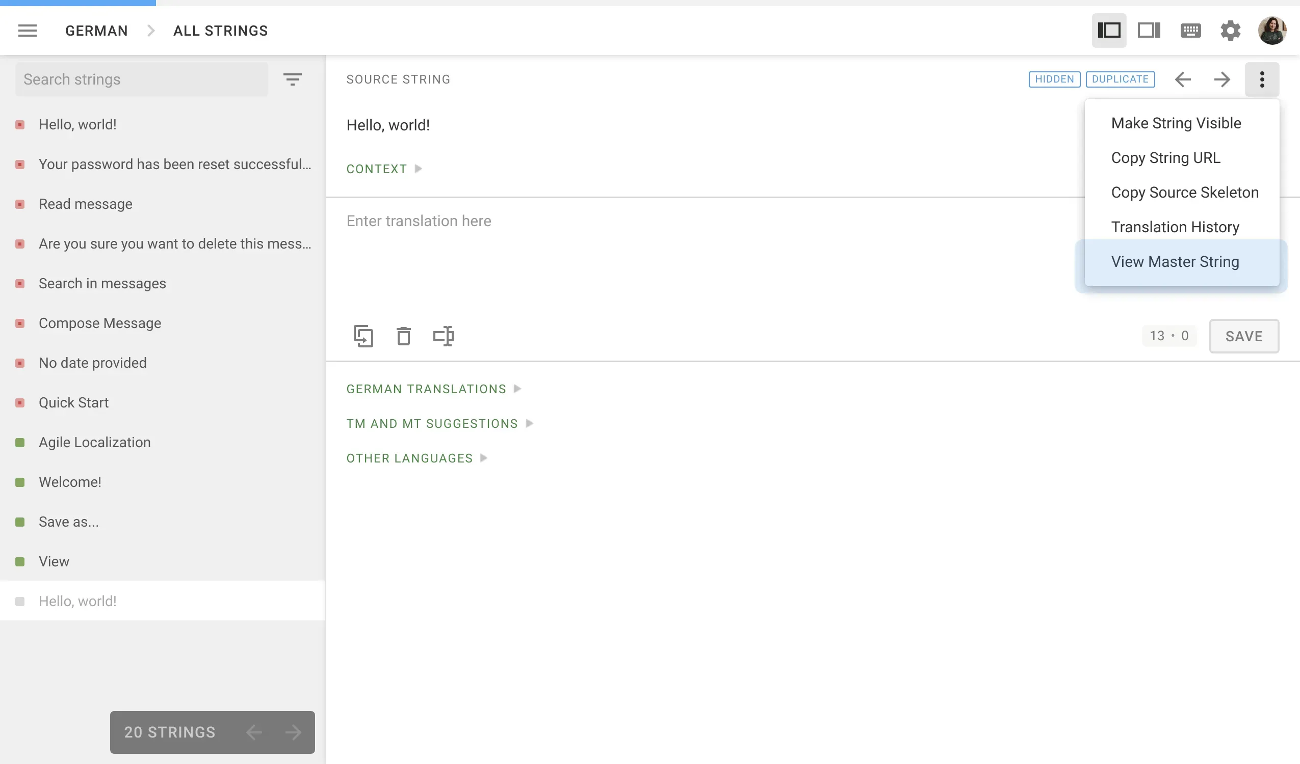 Handling duplicates might be a tricky task. Sometimes translators delete translation for the duplicate and do not understand that they delete translation for the master string as well. To avoid all similar situations and help all project members distinguish and navigate between master strings and their duplicates, we’ve made this update. Now both translators and managers can easily switch to a master string from a duplicate string in the Editor.