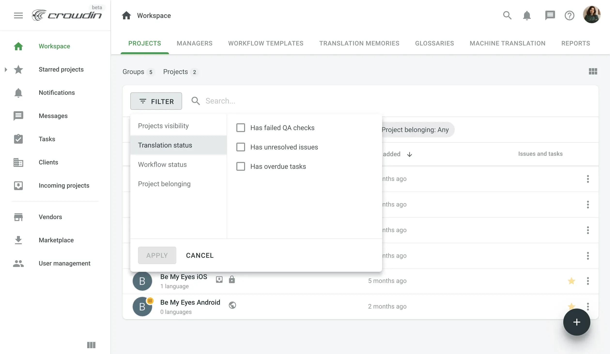 • Filter projects displayed in the Workspace based on project visibility, translation, or workflow status. Vendor organizations will also be able to filter incoming and accepted projects.